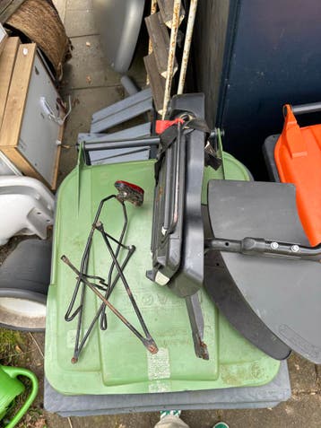 Een zwart bobike fietszitje voor achterop de fiets. Het zitje heeft zwarte kussens en voetsteuntjes. Er zit ook een bagagedrager bij met een rood achterlicht van axa spark. Goed gebruikt maar kan nog