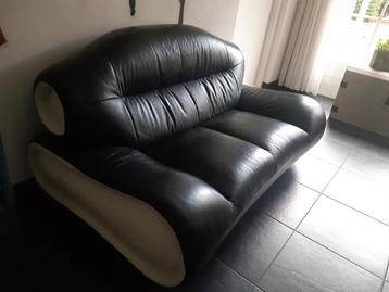 Mooie 2-zits bank van zwart leer met crèmekleurige accenten aan de zijkant. De bank zit comfortabel. Het leer heeft lichte beschadigingen, maar is verder in goede staat. Buitenm aten: 165 x 95 cm