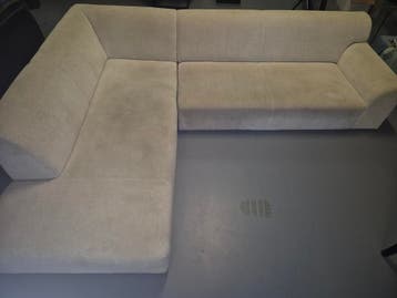 Off-white hoekbank die goed genoeg is voor een tweede leven. Inclusief pootjes en schroeven. Hier en daar wat gebruikerssporen. Afmetingen 190 x165 cm diepte 90 cm hoogte 66 cm de bank is gratis op te