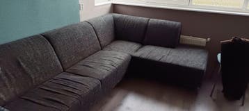Dit is een goed gebruikte hoekbank en wat ouder in een donkere kleur, grijs antraciet. De bank heeft een stoffen bekleding en is gebruikt. De bank bestaat uit meerdere de en en heeft een hoekopstellin