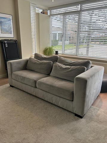 Deze grijze bank heeft een lichte beschadiging aan de onderkant, zoals te zien is op de foto. De bank is verder in prima staat en heeft een stoffen bekleding. Er zijn vier kussens aanwezig. Afmetingen