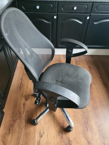 Comfortabele zwarte bureaustoel met een ademende gaasrug en stevige armleuningen. Ideaal voor thuiswerken of op kantoor. De stoel is gebruikt, maar in goede staat en biedt goede ondersteuning. Verstel