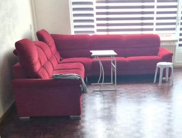 L shaped sofa, consists of 4 parts, one of the parts can be turned to bed and had understorage (two small pillows inside included), upper part is adjustable for head support, be aware there are some s