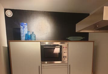 Kookeiland, het frame met de poten blijft staan, plint van 15 cm eronder plaatsen. Veel lades. Vola kraan, composiet zwart blad, belgisch hardsteen. Kooktoestel etna, van zwart glas met gietijzeren ri