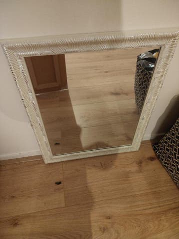 Deze vierkante spiegel heeft een omlijsting die wit is met zilveren details. De rand heeft een patroon. De spiegel is te zien op een houten vloer.