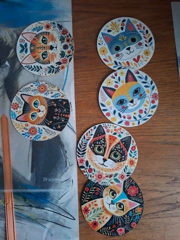 Set van zes ronde onderzetters met verschillende kattenprints.