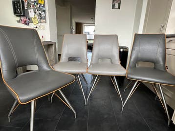 Goede kwaliteit eetkamer stoelen in 2 tinten, donkergrijs en lichtgrijs met lichtbruine biesjes. Er zitten enkele gebruikersbeschadegingen op logischerwijze plekjes. De achterkanten en kleur zijn tipt