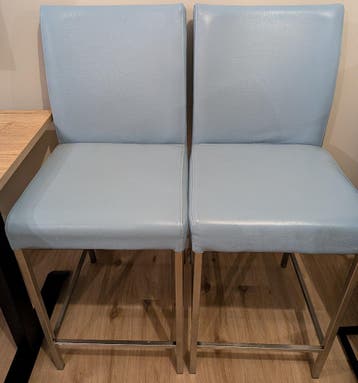 2 blauwe barkrukken met rugleuning, leren bekleding en metalen frame. Bekleding is op sommige plaatsen wat versleten (zie foto's) breedte: 43cm diepte: 48cm zithoogte: 65cm hoogte: 105cm