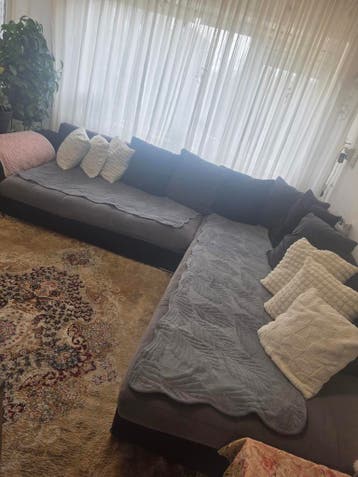 Deze hoekbank is ruim en heeft een donkere kleur. Er liggen grijze en roze plaids op, en er zijn verschillende kussens aanwezig. De bank staat op een tapijt.