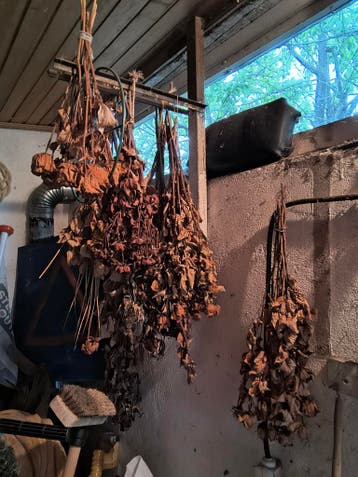 Gedroogde rozen aan. Ze zijn op de kop gedroogd, zoals te zien is op de foto's.