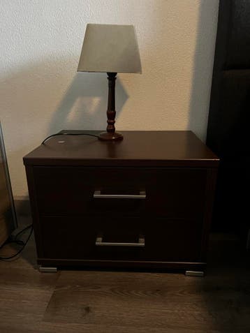 Twee nachtkastjes en een ladekast. De ladekast is 56 cm hoog en 99 cm breed. De nachtkastjes zijn 40 cm hoog en 55 cm breed. Alle kasten zijn donkerbruin van kleur en hebben zilverkleurige handvatten.
