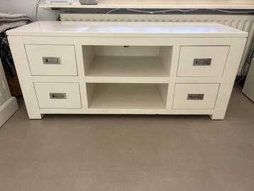 Wit tv meubel met vier handige lades en twee open vakken voor al je media-apparatuur. 128Cm x 45 x 55,5cm alleen op te halen in alphen aan den rijn.