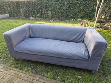 Een klippan bank in een nette staat. De bank is grijs van kleur en heeft een stoffen bekleding. Het is een tweepersoonsbank.