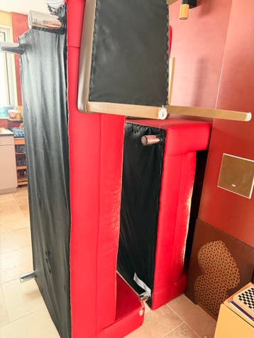 Twee oude bankstellen en twee stoelen. Ze zijn gratis af te halen. Misschien handig voor meubelmakers of mensen die ze willen herbekleden. De banken en stoelen zijn rood en zwart van kleur.