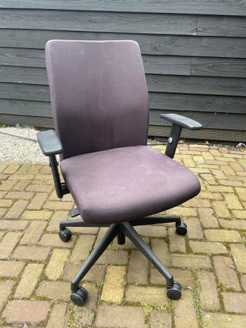 Een donkergrijze bureaustoel met wieltjes en verstelbare armleuningen. De stoel heeft een stoffen bekleding en een kunststof onderstel.