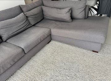 Deze hoekbank is grijs van kleur en heeft afmetingen van 285x230 cm. De bank heeft een stoffen bekleding en komt met bijpassende kussens. De bank staat op houten poten. Gratis af te halen.