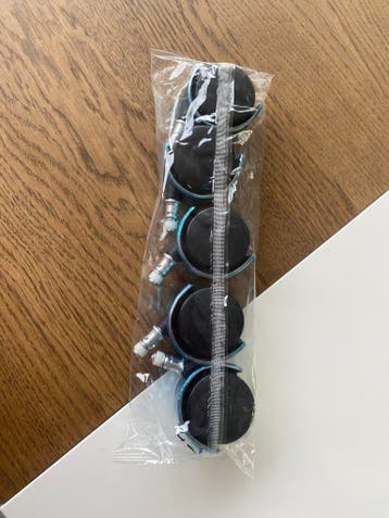 Dit zijn 5 nieuwe wielen voor een bureaustoel. Ze zitten nog in de verpakking. De wielen zijn zwart met zilverkleurige metalen onderdelen.