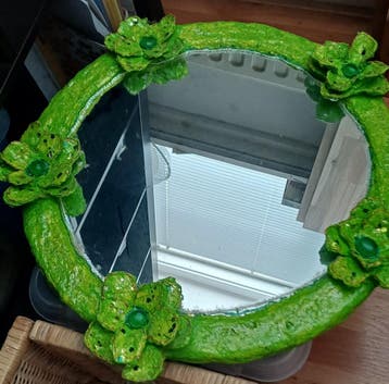 Dit is een zelf geknutselde spiegel met een groene rand. De rand is versierd met gelakt papier maché. Gaat na maandag naar de stort.