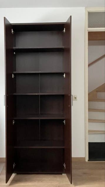 Deze donkerbruine kledingkast heeft twee deuren en is voorzien van meerdere planken. De kast is geschikt voor het opbergen van kleding of andere spullen. De kast is in gebruikte staat. Kast is gedemon
