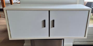 Dit is een wit kastje met twee deurtjes. Het kastje is 82,5 cm breed, 34 cm hoog en 29,5 cm diep. Gratis