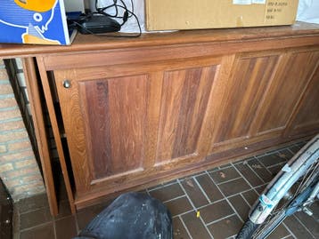 Massief houten kast van taek hout. In goed staat, wel nodig om uiteinden af te werken omdat die onderdeel was van een hoek gedeelte. Afmeting ongeveer 45cm diep en 300cm lang.