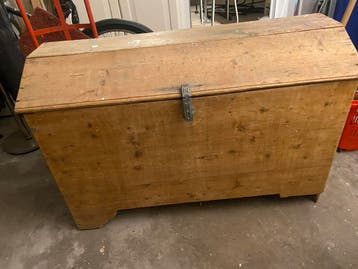 Een blankhouten dekenkist van 112 cm breed en 75 cm hoog op het hoogste punt. De kist heeft een metalen sluiting aan de voorkant en metalen handvatten aan de zijkanten. Binnenin is de kist leeg en hee