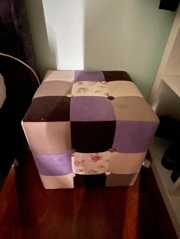Drie comfortabele hockers gratis af te halen. Het betreft twee hockers met een patchwork design in paarse en bruine tinten, en één effen bruine hocker. Ideaal als extra zitplaats of voetenbankje. Zie