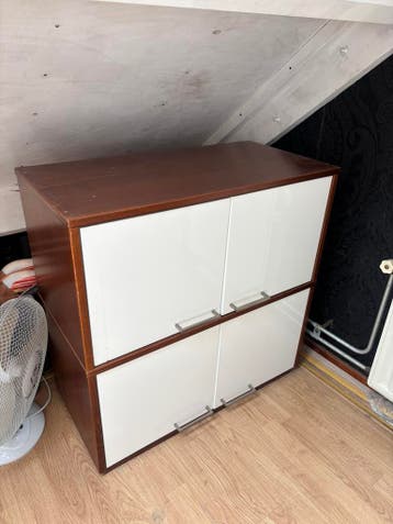 Deze kast is gebruikt maar nog prima op te knappen. Deurtjes werken prima. Afmetinfen: l x b x h : 84 x 82 x 42,5