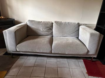 Deze lichtgrijze tweepersoonsbank heeft een stoffen bekleding en chromen poten. De bank heeft twee zitkussens en twee rugkussens. De armleuningen zijn breed en recht. De sloop is volledig afritsbaar z