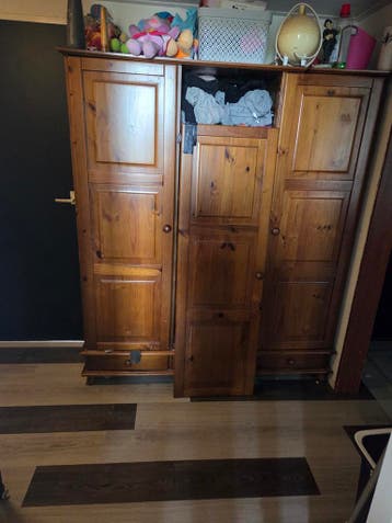 Gratis kledingkast beschikbaar. De kast heeft wat aandacht nodig: een deur moet opnieuw worden bevestigd en de pootjes moeten gelijmd worden. De kast dient zelf uit elkaar gehaald te worden bij ophale