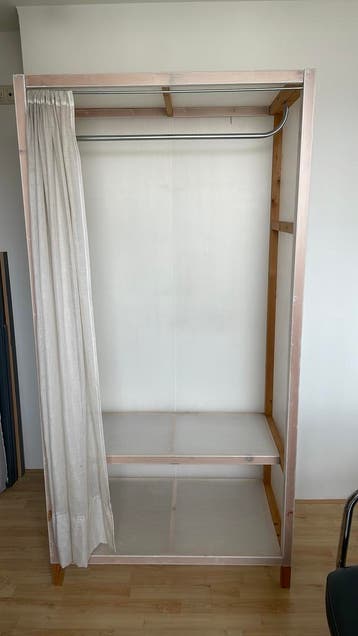 Gratis op te halen: een ruime en lichtgewicht ikea kledingkast met twee planken. Het bestaat uit een houten frame met plastic wanden, een roede en twee planken. Door het gordijntje kun je je spullen n