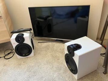 Televisie werkt nog. Boxen ook, met aansluiting voor de audio ingang van de televisie.