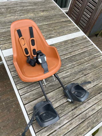 Een fietsstoeltje voorop in een bruine kleur. Het stoeltje heeft zwarte bandjes en voetsteuntjes. Het is een gebruikt item. Riempje is een beetje kapot maar functioneert verder nog.