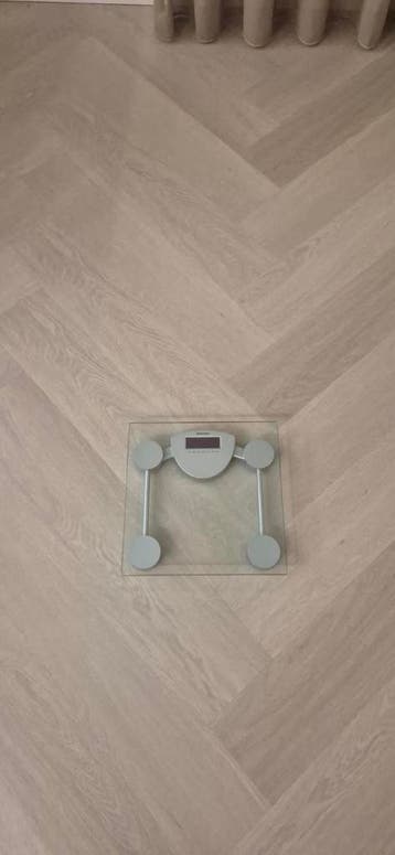 Een digitale personenweegschaal met een glazen oppervlak. Het display is duidelijk leesbaar. De weegschaal heeft vier ronde poten.