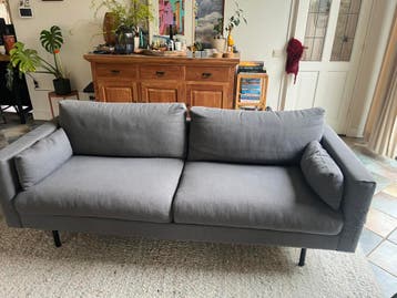Grijze driezitsbank met stoffen bekleding. De bank heeft twee zitkussens en twee rugkussens. Op de kopse kant zitten beschadigingen (zie foto’s), verder is de bank nog netjes. De bank is 210 centimete