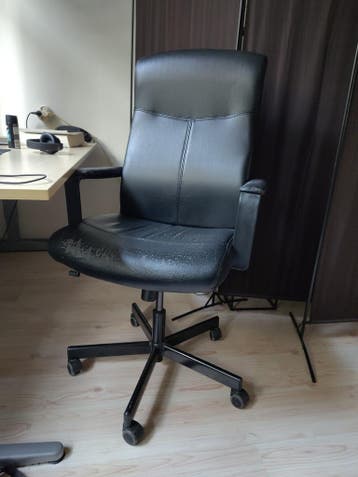 Een zwarte bureaustoel met wieltjes. De zitting heeft wat slijtageplekken. De rugleuning en armleuningen zijn nog goed. De stoel is in hoogte verstelbaar.