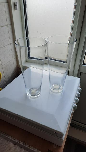 Twee glazen vazen, helder van kleur met onderin een gaatje voor kerstverlichting. Ze zijn even groot en hebben een brede opening aan de bovenkant. De vazen zijn 35cm hoog en hebben een diameter van 17