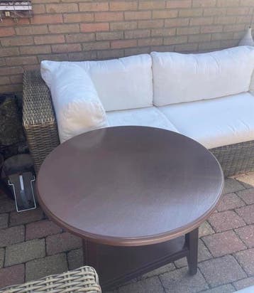 Deze ronde bijzettafel is chocoladebruin van kleur. De tafel heeft een extra plank onder het tafelblad. De poten hebben een gedraaid detail.