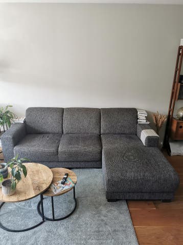Grijze 2.5-Zits met chaise. Gebruikt, maar ziet er nog goed uit. Middelste gedeelte is een klein beetje ingezakt. Afmetingen: 2.40M breed x 0.85M diep x 1.60M diep chaise. Let op: 13 of 14 april ophal