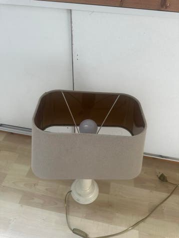 Gratis af te halen: een klein lampje met een stoffen kap en een witte voet. Ideaal als sfeerlicht of nachtlampje. Werkt nog perfect.