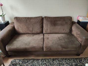 Dit bankstel bestaat uit een bruine 3-zitter en een bruine 2,5-zitter. De banken zijn stevig. De afmetingen in cm: drie zitter: diepte 90 - lengte 200 - hoogte 80 - zithoogte 40. De twee en een halve