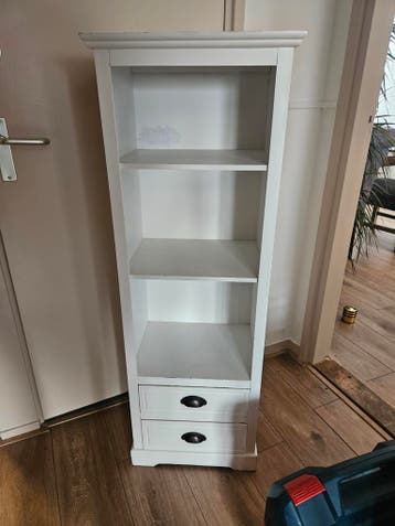 Een wit kastje met twee lades onderaan en drie open planken erboven. Het kastje is 125 cm hoog, 44 cm breed en 32 cm diep. Het is een handig kastje voor spullen of boeken. Bovenste open vak is een gaa