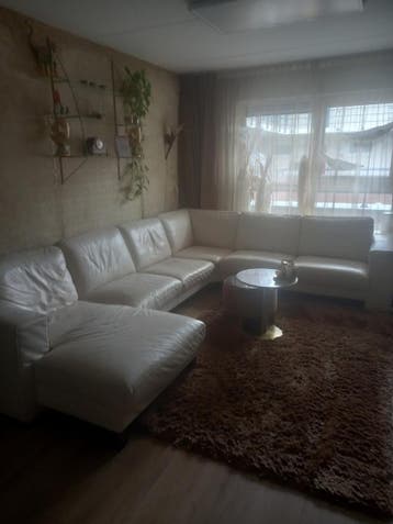 Een crème leren hoekbank. De bank heeft een lange chaise longue aan de linkerkant en een breder zitgedeelte aan de rechterkant. De bank is gebruikt wat met name te zien is bij de chaisse longue. Hier