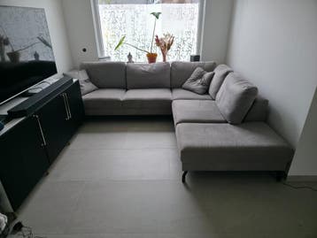 Grijze hoekbank, zoals op de foto's te zien is. De bank is gratis op te halen. De kussens zijn inbegrepen. De bank heeft een stoffen bekleding.