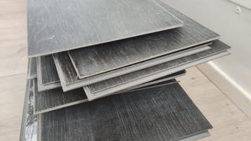 Zwart/donker eiken click pvc circa 50m2 zit onder het stof en verfspatten, maar zijn nog goed schoon te maken makkelijk te leggen en te snijden met een stanley mes ideaal voor in een schuurtje of klei