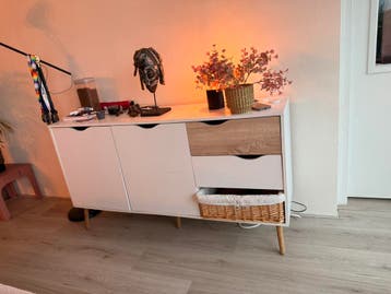 Fijne kast met wat gebruikersbeschadigingen: vlek bovenkant en een deurtje wat lastig weer sluit. Gratis op te halen.