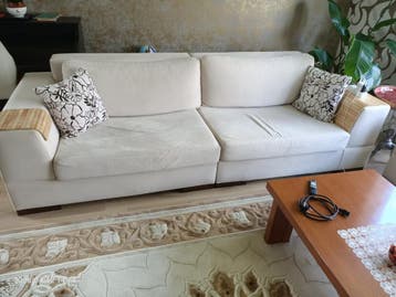 Deze zitbank is crèmekleurig en heeft twee zitkussens. De armleuningen zijn comfortabel. Er liggen vier kussens met een zwart-wit bloemmotief op de bank.