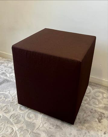 Deze bruine poef is gratis af te halen. Hij is vierkant en heeft een stoffen bekleding. Hij kan gebruikt worden naast een boxspring.