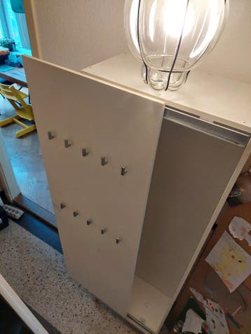 Schuifdeurkast, prima staat. ÉÉN plek op de deur, zie foto. - Afmeting 60*34*198cm - schuifdeur links-rechts (tot de helft) - 7 stalen legplanken - 2*5 haakjes op de deur - 2 knopjes op de zijkant oph