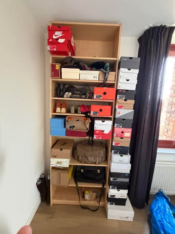 Deze billy boekenkast met opzetstuk is gratis af te halen. De kast is extra hoog. Gratis af te halen als je hem zelf uit elkaar haalt.